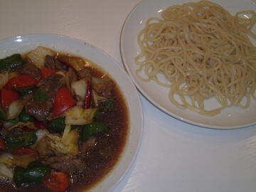 これはラグマン(丸麺)に羊肉野菜炒め。
