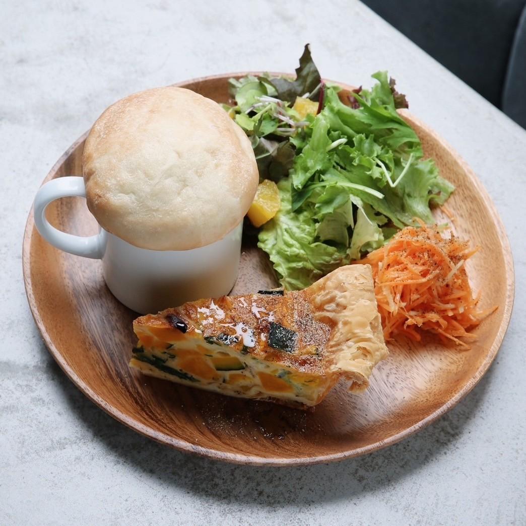 カップスープにパイ生地で蓋をしてオーブンで焼き上げた“ガルショーク”は、モチモチの生地をスープに絡めて食べるという自慢のメニューです。ランチの【ガルショークプレート】はその他にキッシュやサラダなどが盛られていて、身体も美容も意識した一皿になっています。