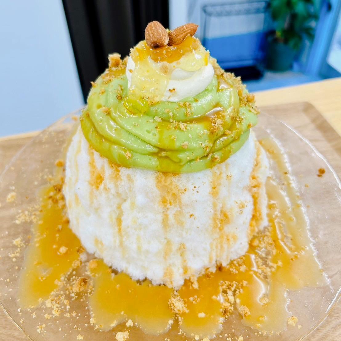 外はピスタチオシロップに生クリームを使ったピスタチオクリームをのせ、さらに生のピスタチオがトッピングされています。