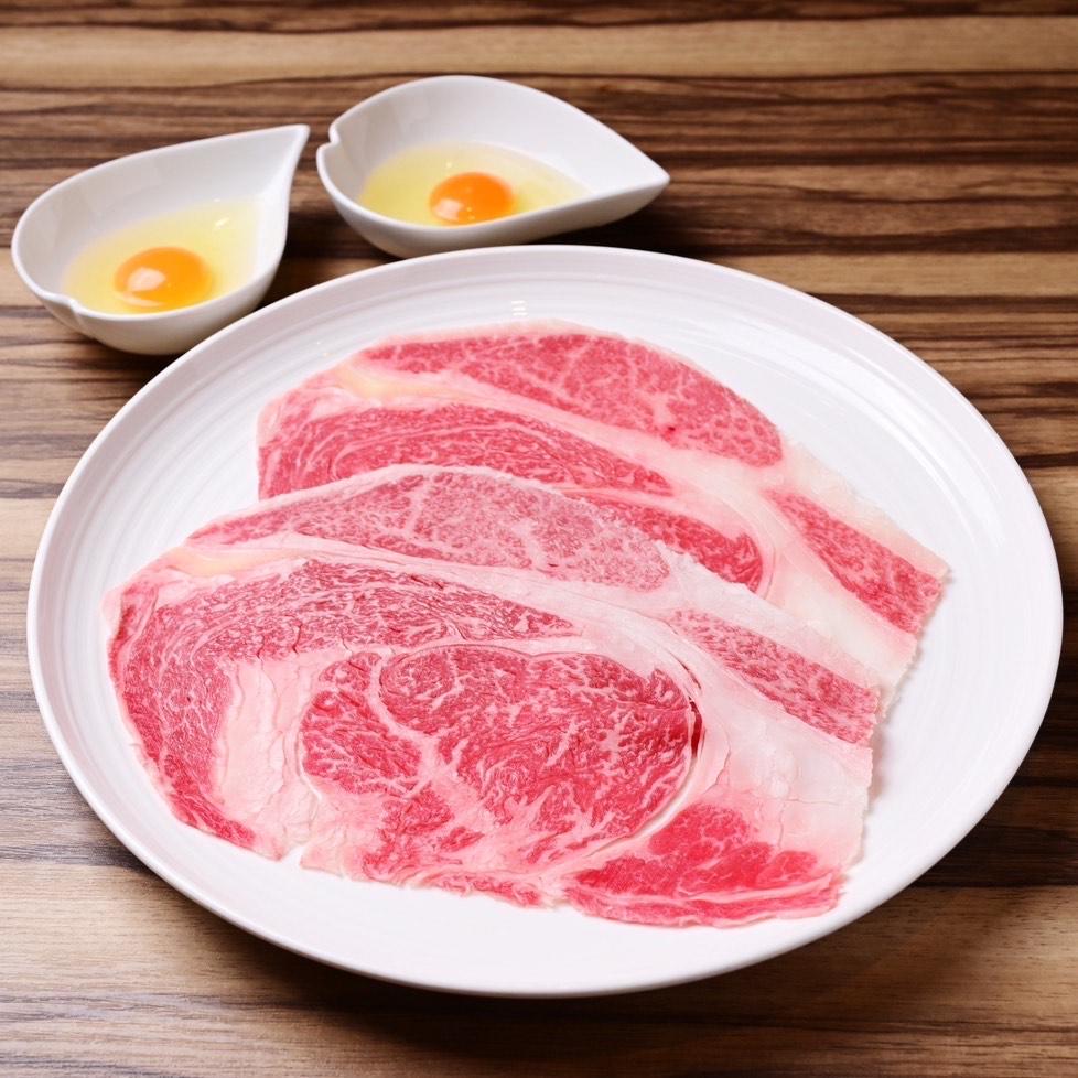 精香園三大名物の一つ【炙り極みリブロース】は、上ロースを薄くスライスしています。さっと焼いてすき焼き風に溶き卵につけて味わっていただきます。適度な脂と赤身の旨味がたまらない逸品です。
