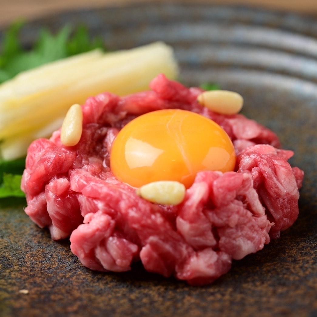 【特選ユッケ】は生肉許可を取得して提供しています。口の中でとろけるような柔らかさと濃厚な風味が広がります。