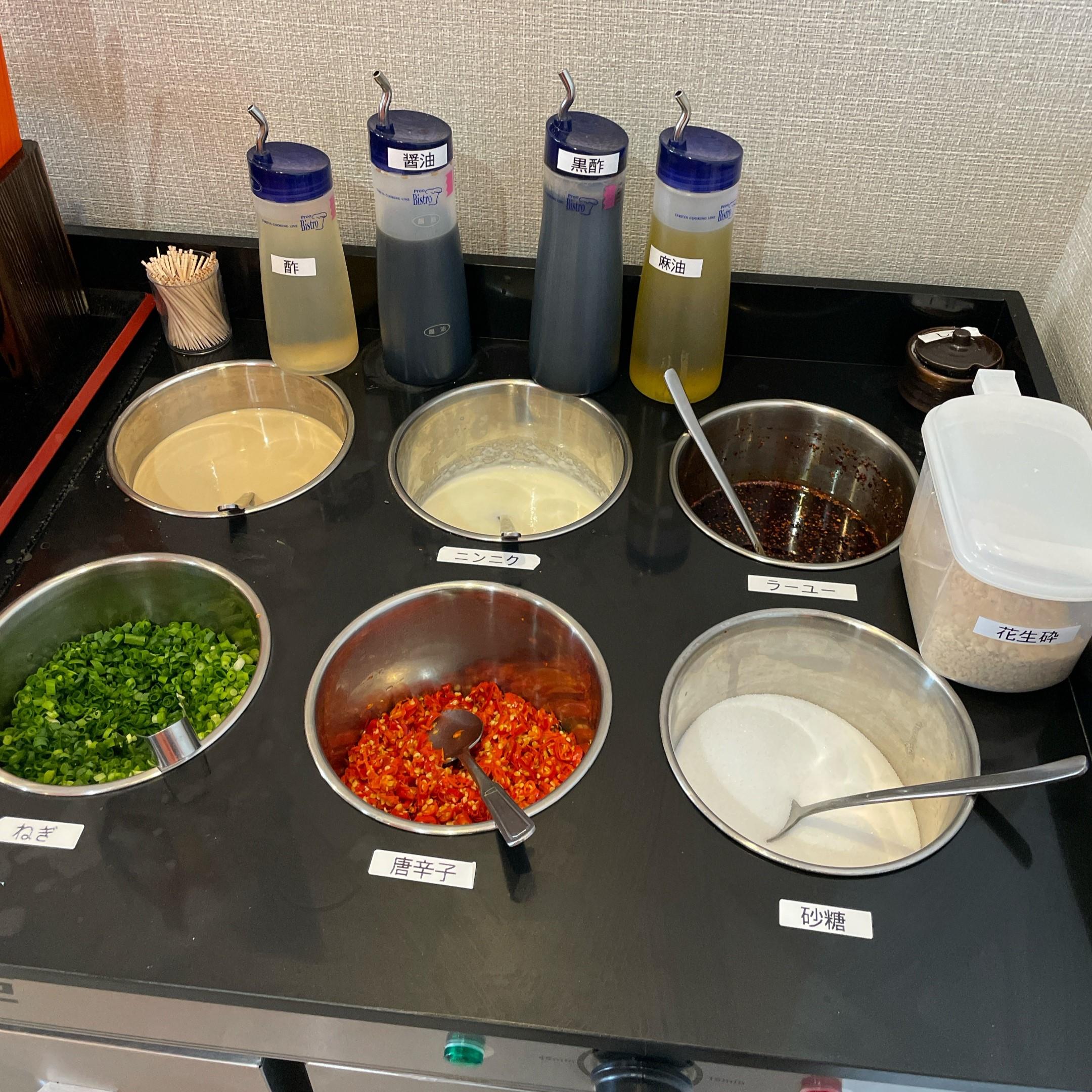 自由に利用できるセルフサービスの薬味コーナーがあり、唐辛子やラー油、酢、ネギ、ニンニク、油などが用意されているので、辛みの調節や味変することもできます。