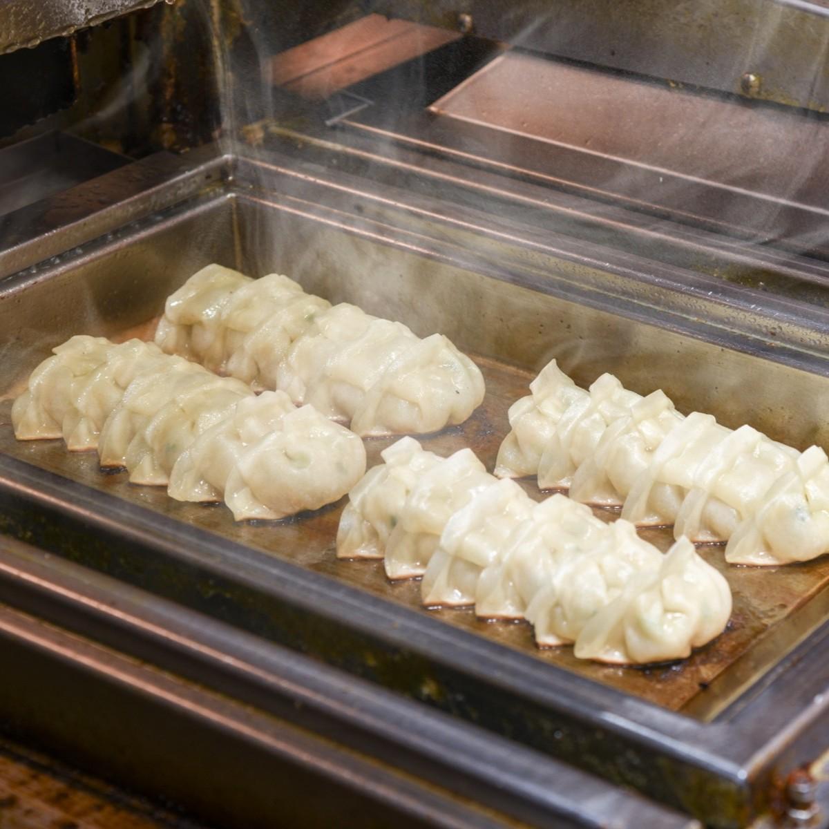 看板メニューの一口サイズの【ストライクの焼き餃子】は、国産食材を使い、店内で注文が入ってから焼き上げています。薄めの皮のため、外はパリッと中に旨味がギュッとつまっています。