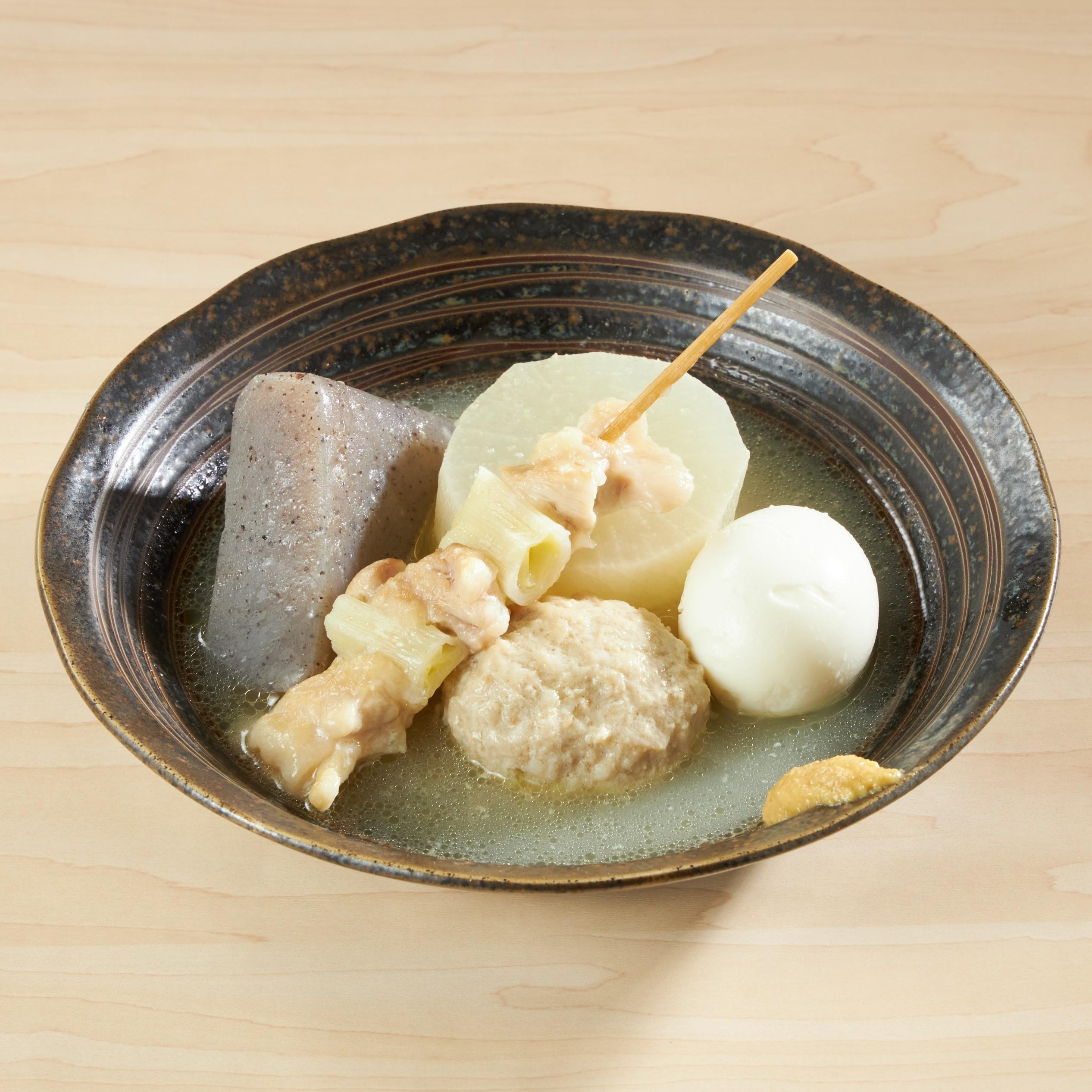 【鶏出汁おでん】は鶏出汁がしっかりと効いたおでんで、さっぱりとしていながらコクがあり、季節を問わず味わうことができます。