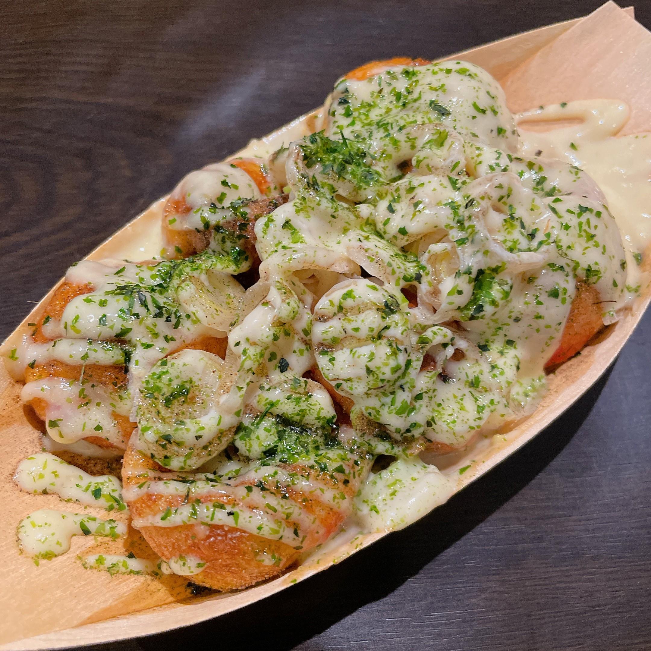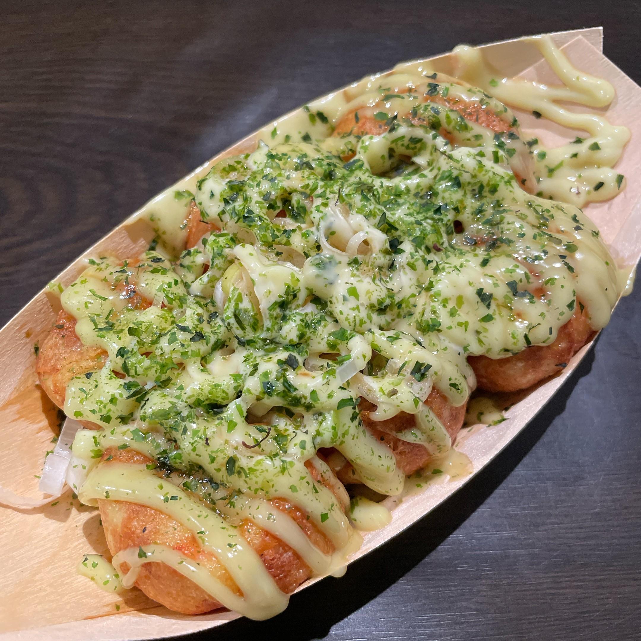 一番人気で店の看板メニュー【ねぎ柚子ダレ胡椒マヨ】は、たこ焼きに塩、コショウ、ゴマ油で味付けをし、ネギとオリジナルの“柚子胡椒マヨ”をかけています。
