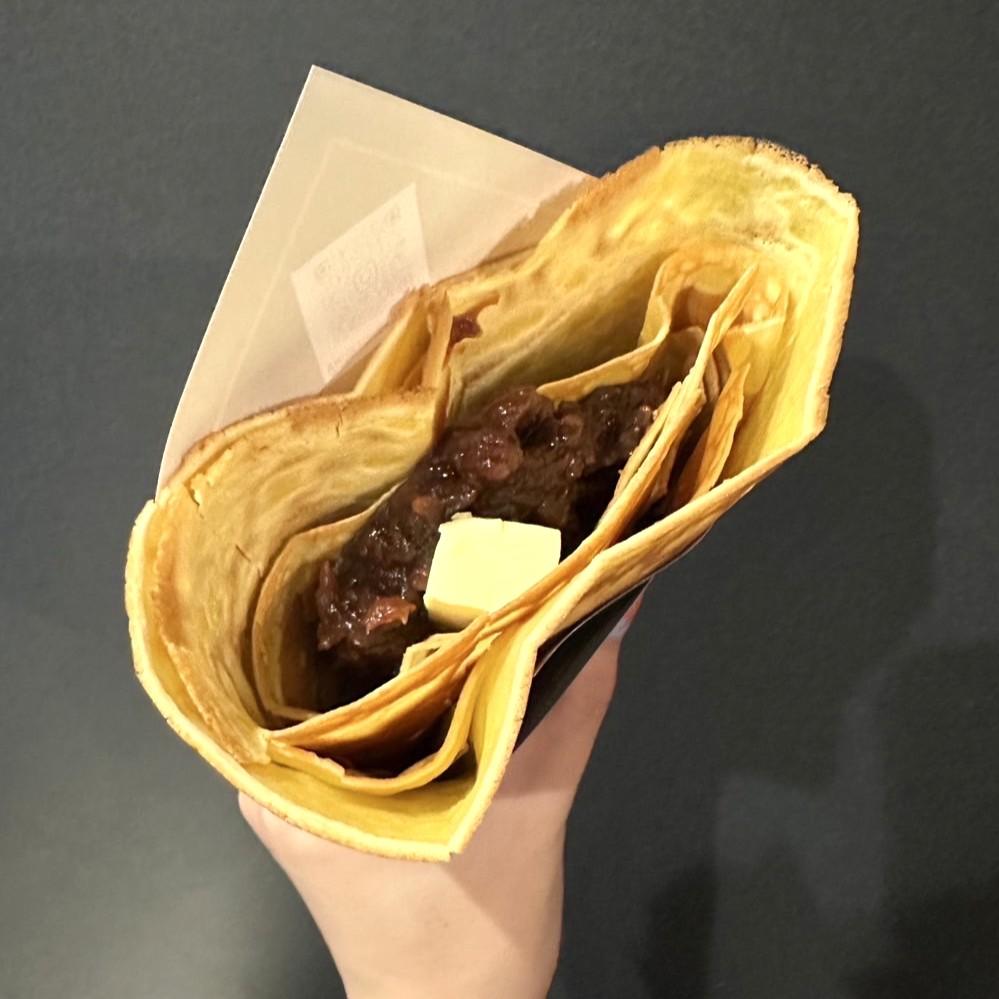 【キャラメルナッツホイップ】は、濃厚なキャラメルソースと香ばしいアーモンドがアクセントのクレープです。
