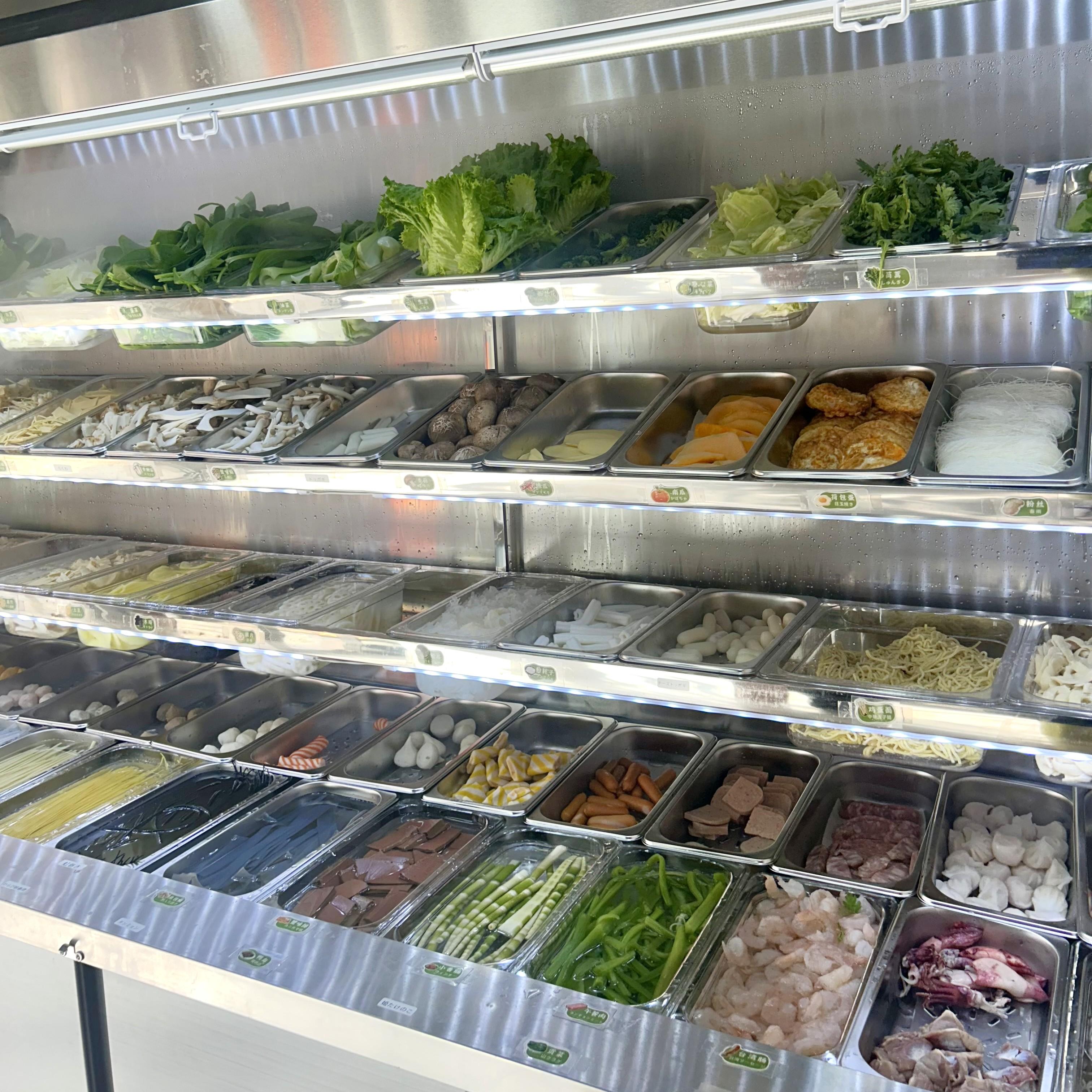 店内には、分かりやすく食材名が表示された具材が71種類並んでいます。セルフで具材を選び、100gの重さで料金が決まるシステムです。具材に並ぶ野菜は、毎日仕入れているため、鮮度が自慢です。