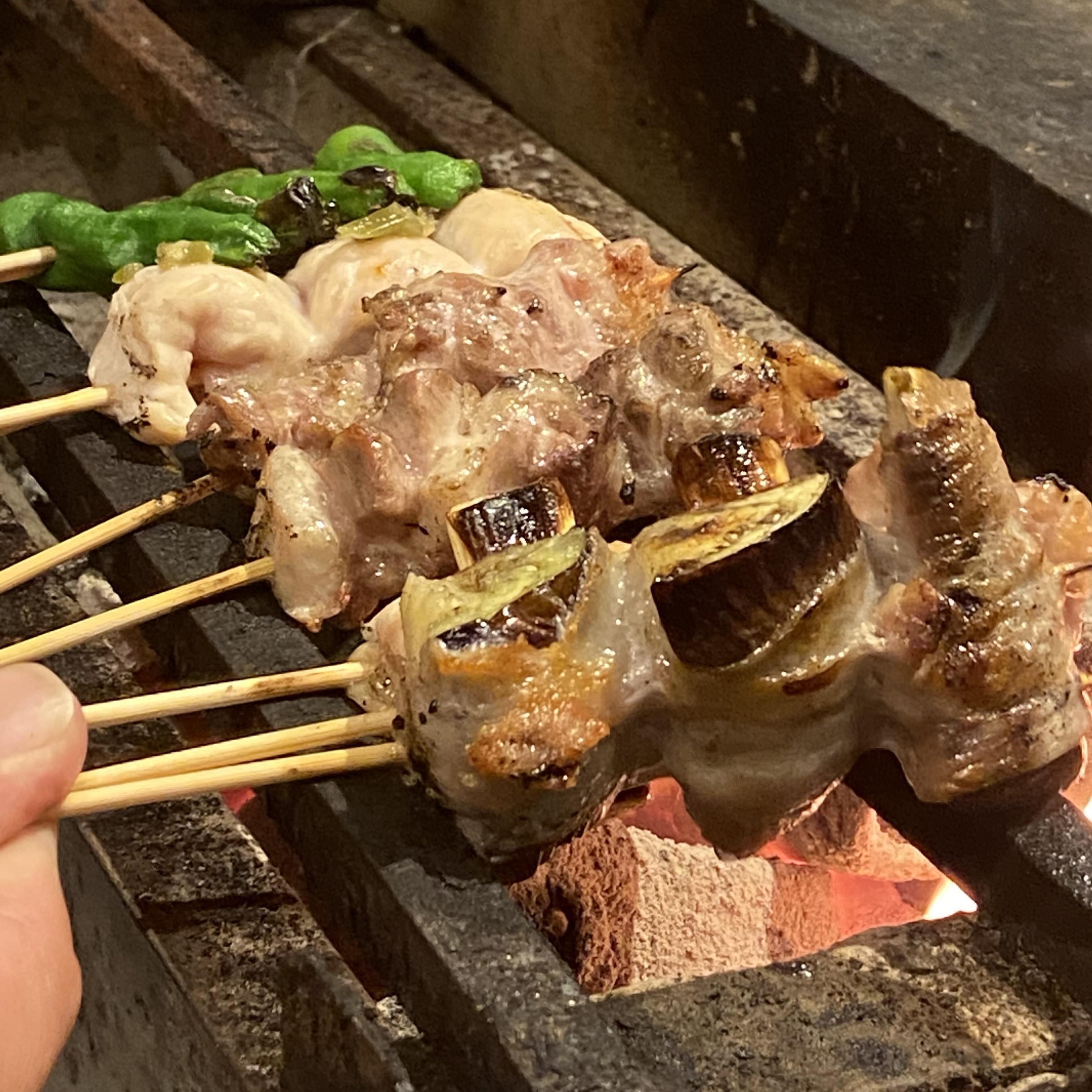 皮が薄く脂肪が少なく、鶏本来のうま味があり、肉質の良さが特徴の朝〆の奥三河鶏を使った“鳥刺し”に、炭火で焼く“焼鳥”は、お好みの部位や盛り合わせで楽しむことができます。