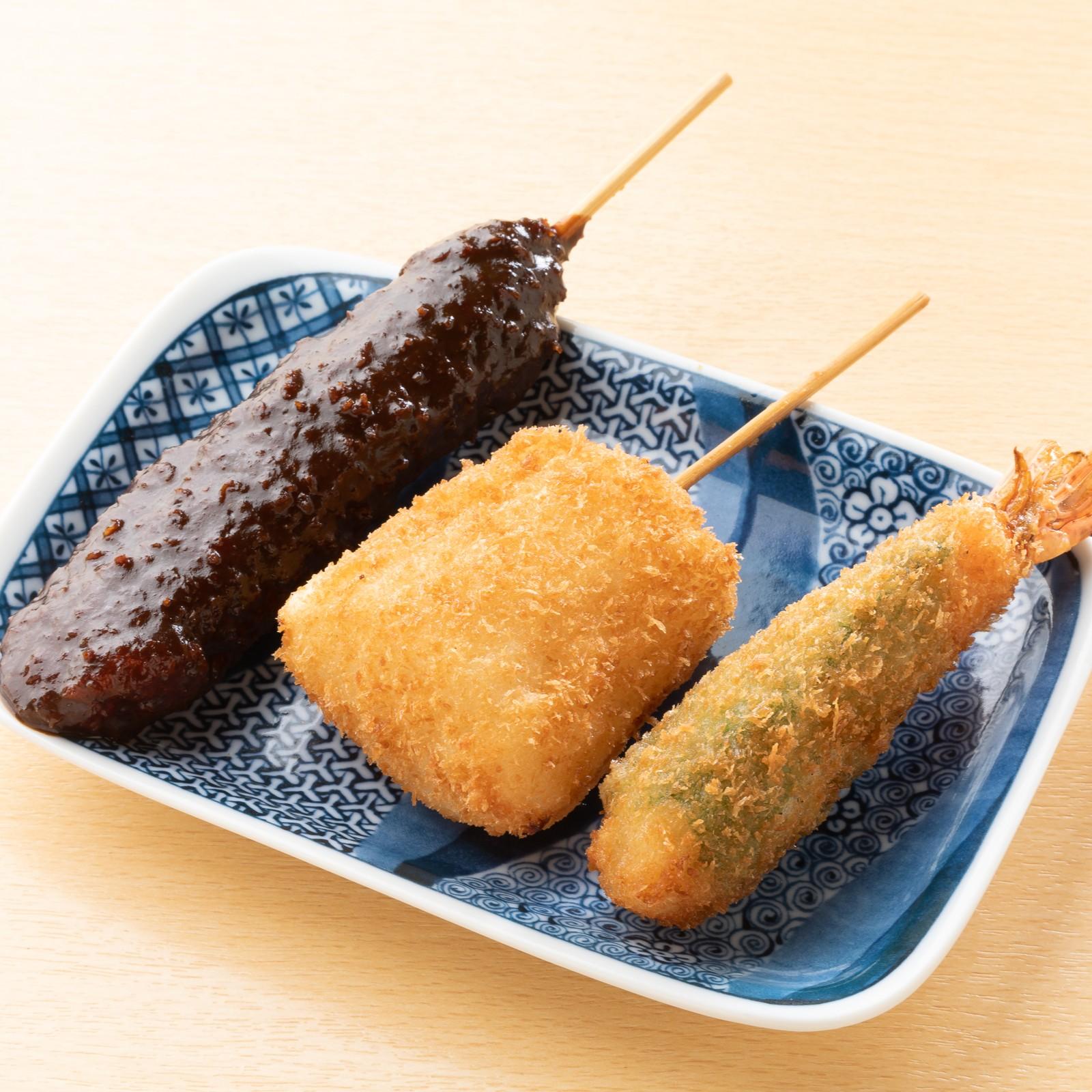 一番人気の【串揚げおすすめ3本セット】は、こだわりの味噌タレにひたした”味噌串カツ”に“海老しそ巻き”、珍しい“大根”がセットになっています。