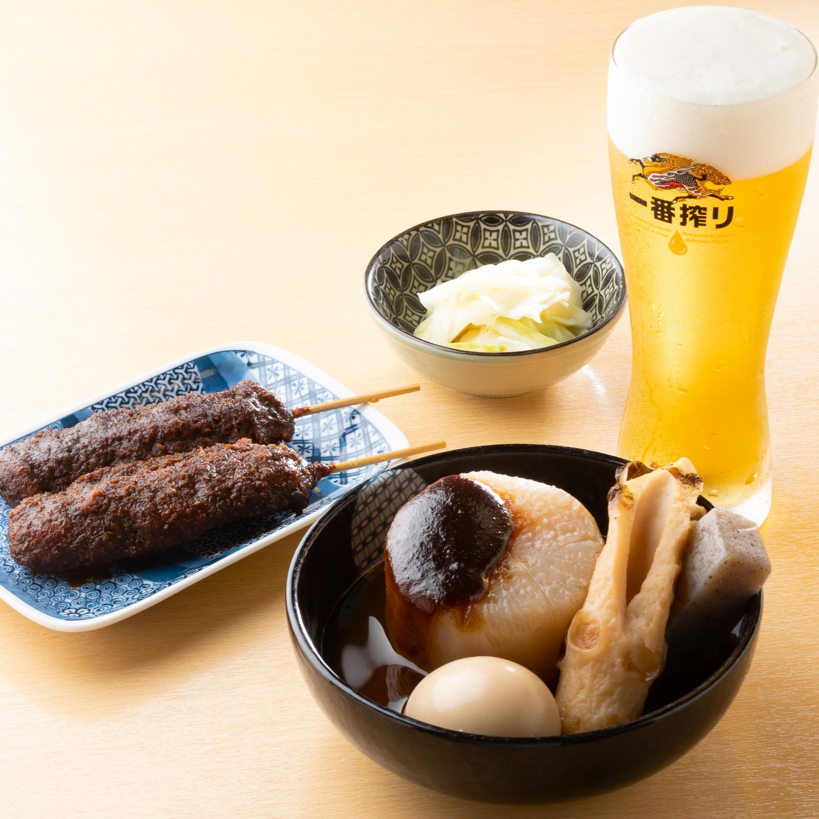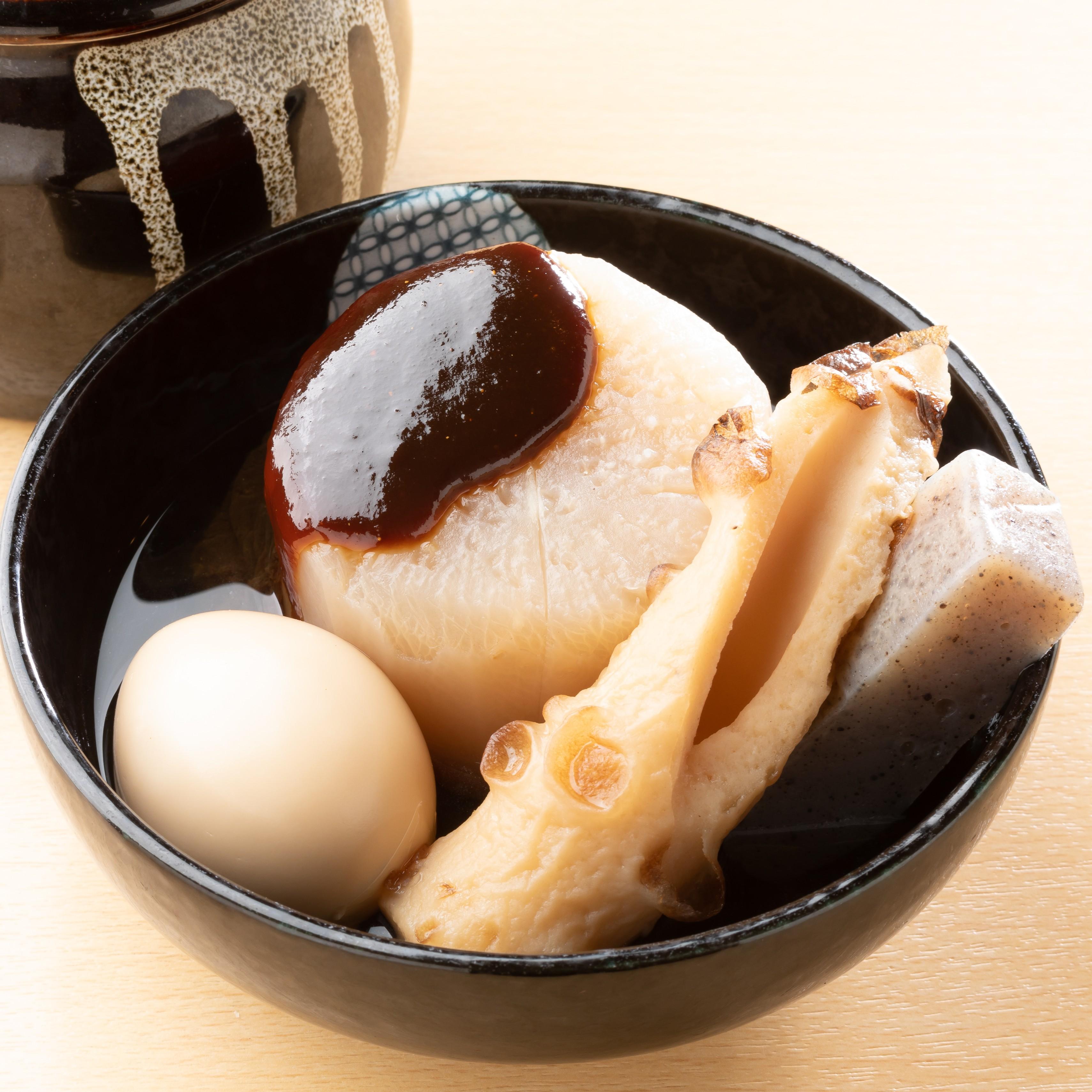 おでんは自家製出汁にこだわりの塩を加えて煮込んだシンプルな味付けで、お好みで手作りの赤味噌を足して味わうスタイルです。夏には”冷やしおでん”も登場します。