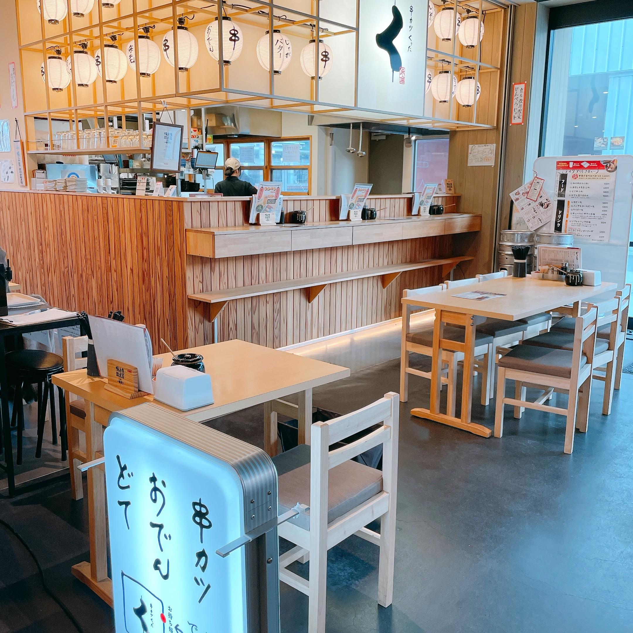 立ち飲みとテーブル席があり、一日を通して気軽に串カツとおでんを楽しむことができます。