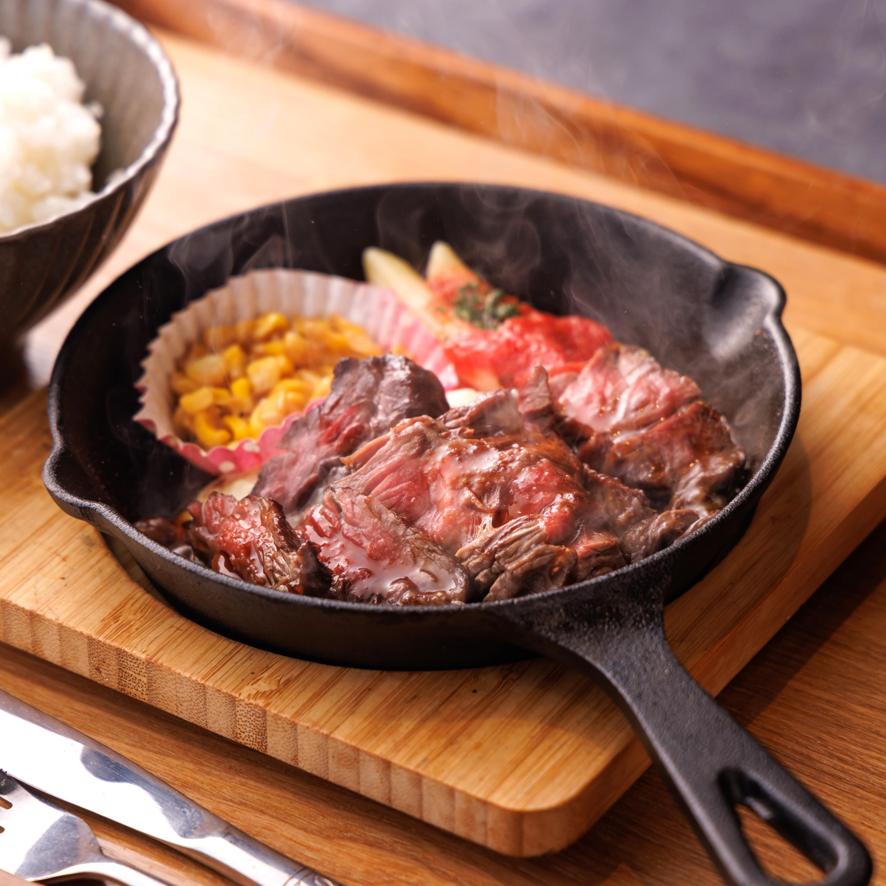 数量限定【牛ハラミステーキ】は、ハラミを香り高く焼き上げています。口の中で旨味が広がる一品です。鉄板で提供するため、アツアツでジューシーさが続きます。