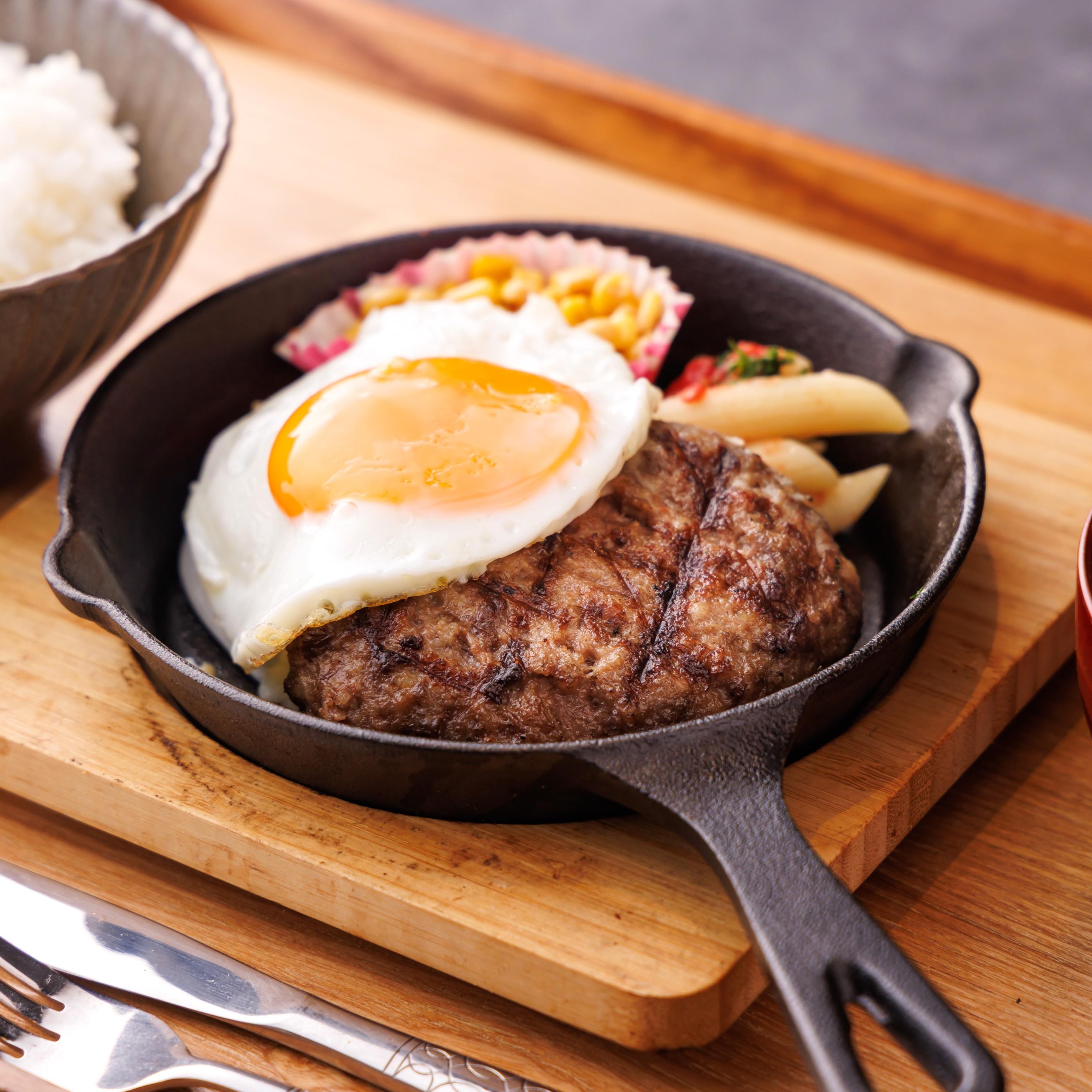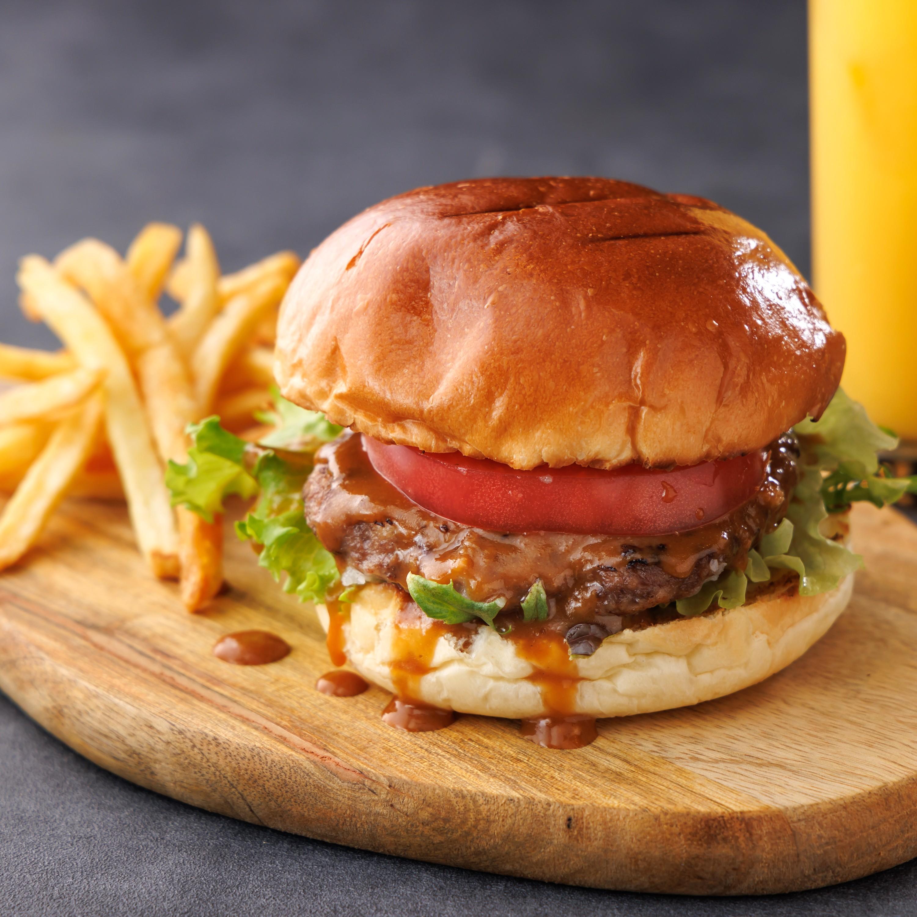 ハンバーグとハンバーガーのパテには、仕入れてすぐの粗挽きした牛タンを使っています。ここに牛脂と飛騨牛のミンチとつなぎを少なめに独自配合することで、牛肉100%ならではの肉の旨味とジューシーさを感じるバランスの取れた焼き上がりになります。