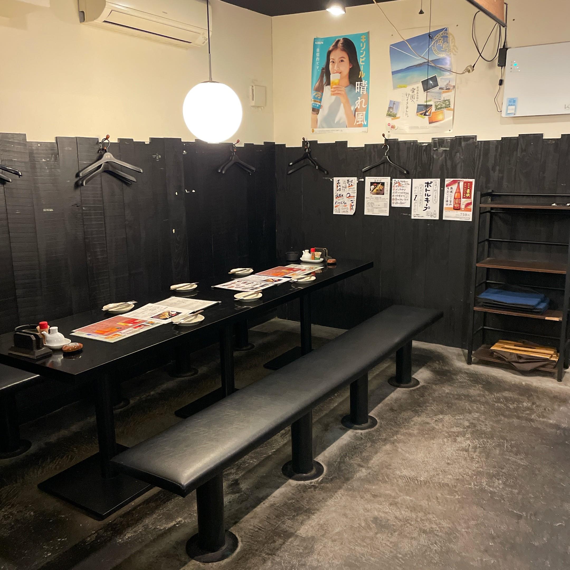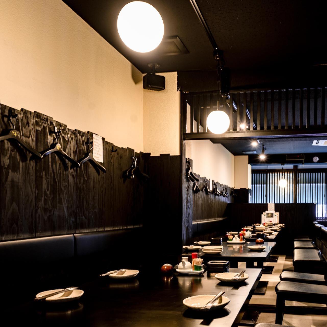 店内はボトルキープなどの瓶が並び、ほっとする雰囲気です。カウンターにテーブル席、2階に40名の宴会が可能な空間もあるため、幅広い用途で使用されています。夜の定食もあるため、気軽に夕飯を楽しむ人など、幅広い世代が訪れています。