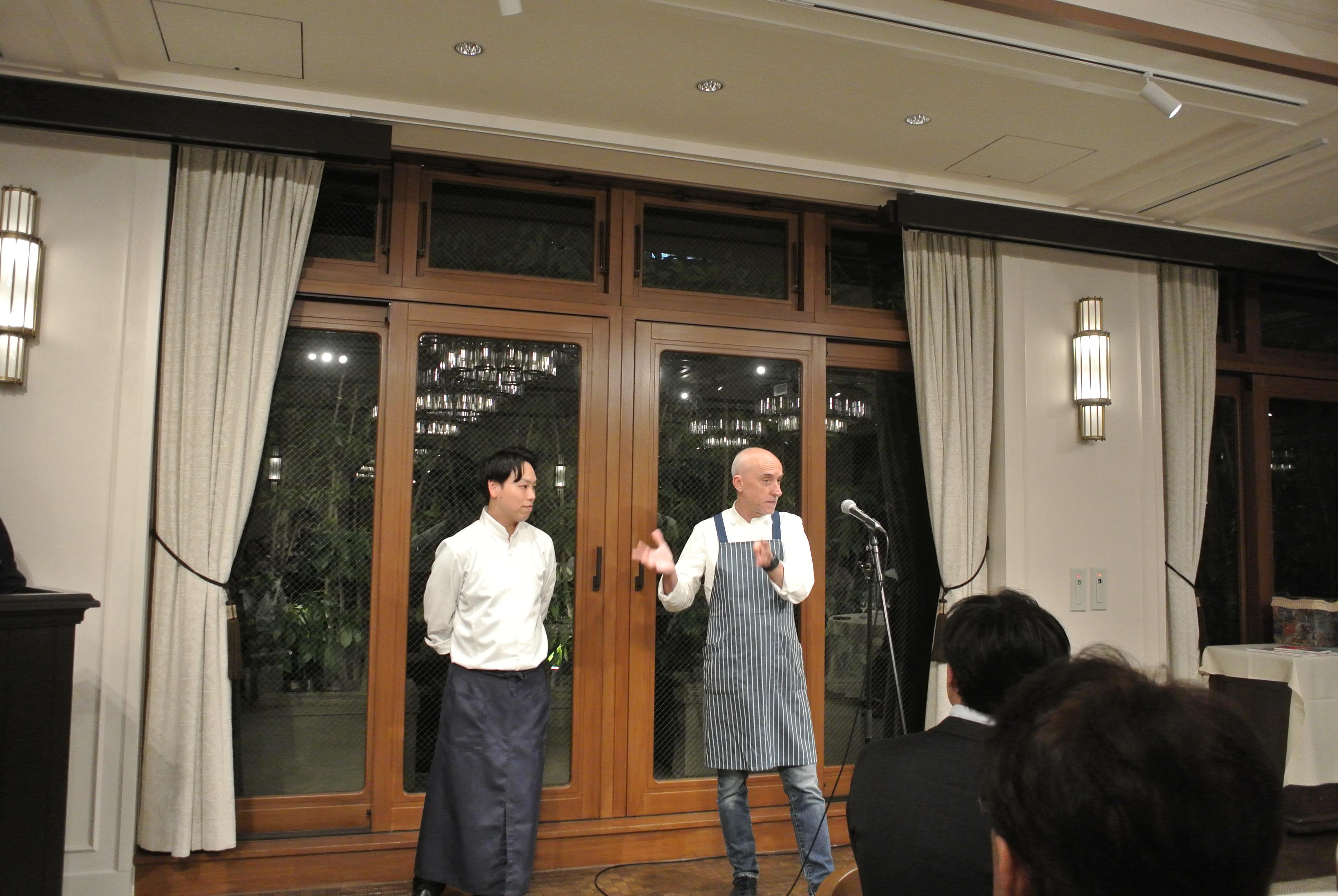 今回は初めてのスペインとイタリアのコラボイベントでしたが、スペインのカヴァで乾杯のあとそれぞれのシェフ考案のピンチョスから始まり、マッシュルームスープ、お米料理はホタテとパンチェッタのマルイモンターニャアロスアバンダ、肉料理のピンチョモルノ・鶏肉トマト煮込みピペラードソース、デザートピンチョスまでスペインとイタリアの共演をお楽しみいただきました。