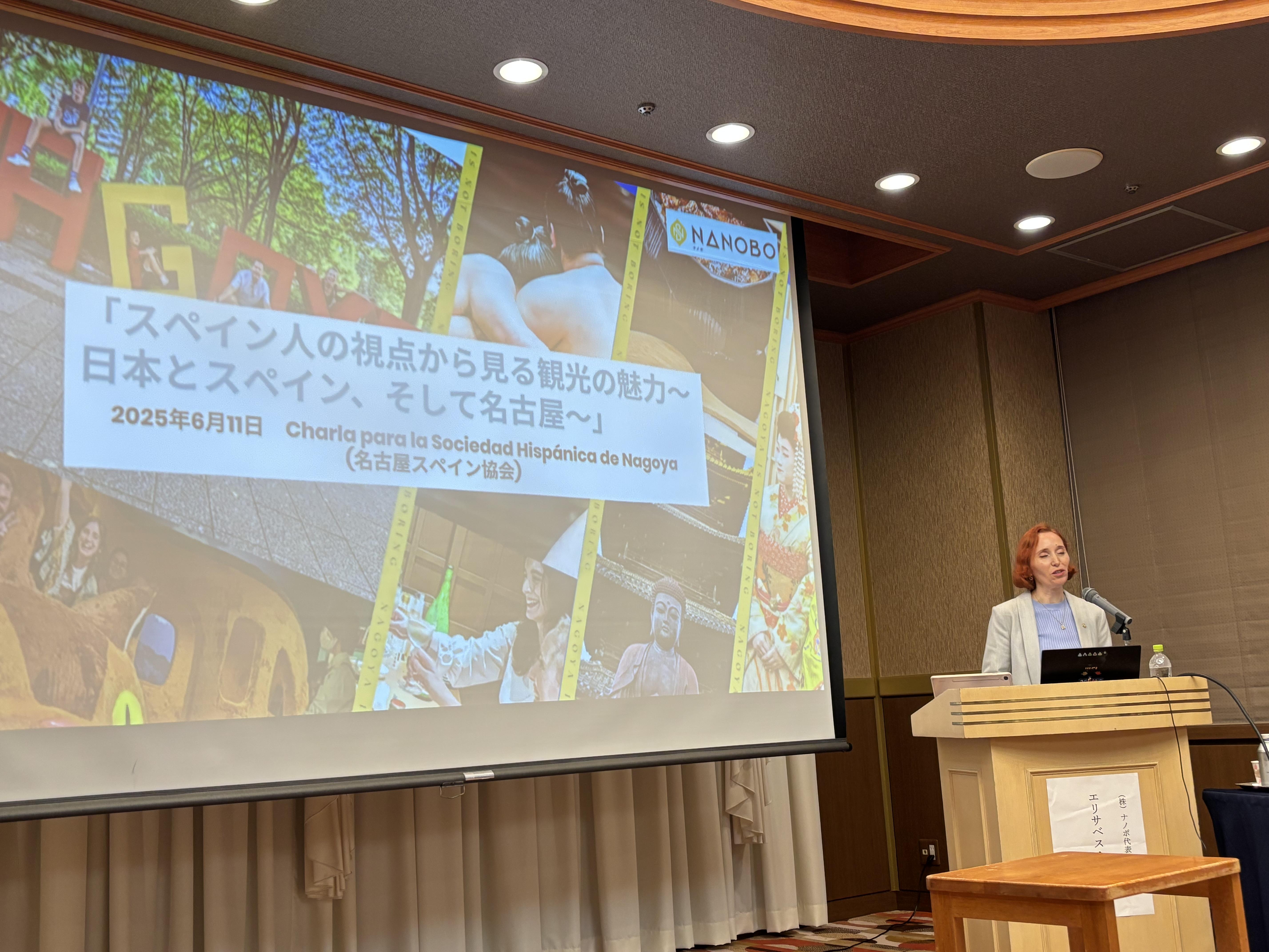 2025年度の総会終了後、名古屋在住スペイン人旅行ガイドのエリサベス・ヨピスさんをお招きし、トークショーを開催しました。テーマは「スペイン人の視点から見る観光の魅力~日本とスペイン、そして名古屋~」。日本とスペインそれぞれの観光文化の違いや共通点について、特に外国人旅行者にとっての日本の魅力、更に名古屋の伝統や食文化などの魅力を如何に海外に発信できるかを、スペイン人観光客の感覚をもとにお話しして頂きました。その後、スペイン協会の黒田薫子さんの乾杯でパーティーは始まり、会員の皆様は懇親を深め、盛況のうちに終了となりました。