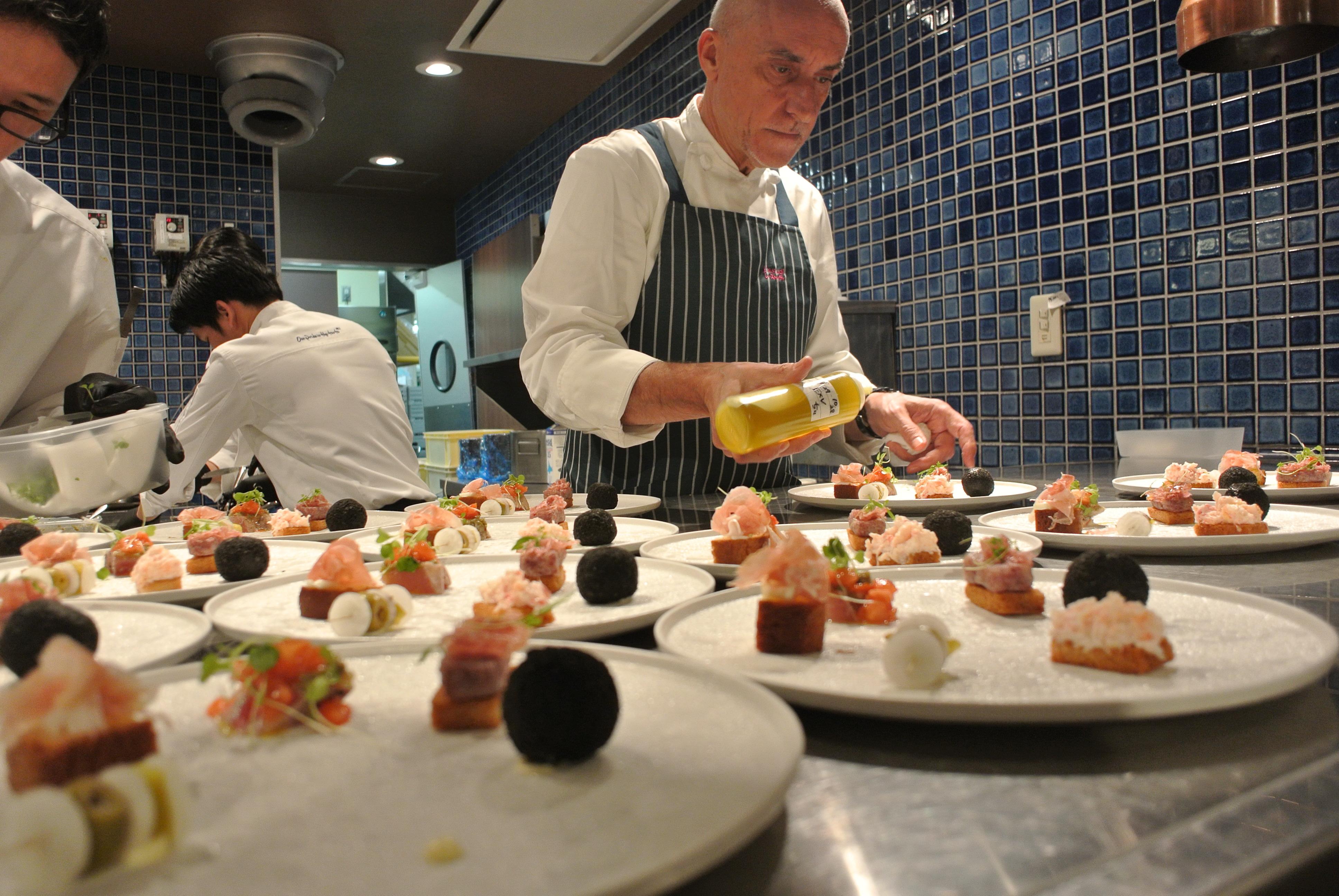 名古屋スペイン協会恒例のタパスパーティー「Fiesta de Tapas!」が、10月7日に「ザ カワブン ナゴヤ」にて開催されました。今回会場になったのはイタリアンの名店「ザ カワブン ナゴヤ」2階のクラシカルなシャンデリアに気品漂う「ザ ボールルーム」。二面ガラス張りの窓に囲まれた開放感のあるゆったりとした空間でスペイン料理の巨匠ホセ・バラオナ・ビニェスシェフとカワブンの中島シェフによる料理を堪能しました。